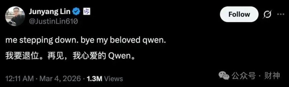 就在这场被外界解读为“阿里AI计谋再动员”的会议扫尾十余小时后,3月4日凌晨,林俊旸在外交平台X发文:“me stepping down. bye my beloved qwen.”(我卸任了。相遇了,我亲爱的千问。)