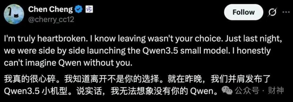签字为Qwen孝顺者的Chen Cheng第一期间转发推文称:“我知说念离开不是你的承袭。昨晚,咱们还在并肩发布Qwen 3.5小模子。”