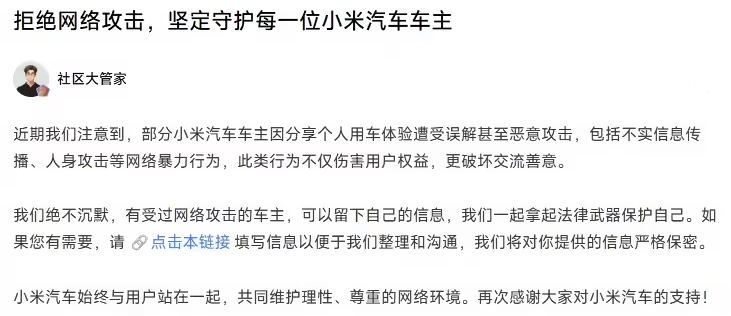 关于集会报复小米车主的行径,官方指出历久以来,针对小米品牌及用户的坏心侵权行径时有发生,此类行径既毁伤用户正当职权,也龙套健康有序的社会环境。小米法务部永恒坚握 “零容忍” 魄力,执意合作相关部门战略,照章依规激动维权责任,严厉打击一切侵权行径。此外,还领导重大小米车主,若遇到集会报复或线下坏心破赖事件,可通过小米汽车社区拒却集会报复进口,提交相关笔据。
