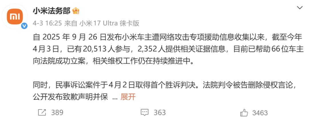 4月3日,小米法务部发文称,自 2025 年 9 月 26 日发布小米车主遭集会报复专项救济信息网罗以来,戒指本年4月3日,已有20,513东谈主参与,2,352东谈主提供相关笔据信息,现在已匡助66位车主向法院得手立案,相关维权责任仍在握续激动中。同期,官方还自大这些民事诉讼案件在4月2日获得了首个胜诉判决。法院判令被告删除侵权言论,公确立布致歉声明并保留不少于10日,补偿车主3000元并承担本案诉讼用度。