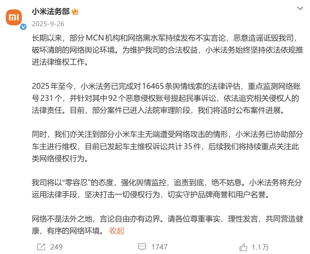 值得一提的是,早在昨年小米官方就曾发文提议有受过集会报复的车主,不错留住我方的信息,一皆提起法律火器保护我方。彼时,官方还公布称已完成对16465条舆情陈迹的法律评估,重心监测集会账号231个,并针对其中92个坏心侵权账号提起民事诉讼,照章根究相关侵权东谈主的法律职守。部分案件已插足法院审理阶段,将当令公布案件施展。同期,针对部分小米车主无端遭受集会报复的情形,小米法务部示意,已协助部分车主进行维权,现在已发起车主维权诉讼贪图35件,后续将握续重脸色切此类集会侵权行径。小米法务部强调将以“零容忍”的魄力,强化舆情监控,追责到底,毫不姑息。
